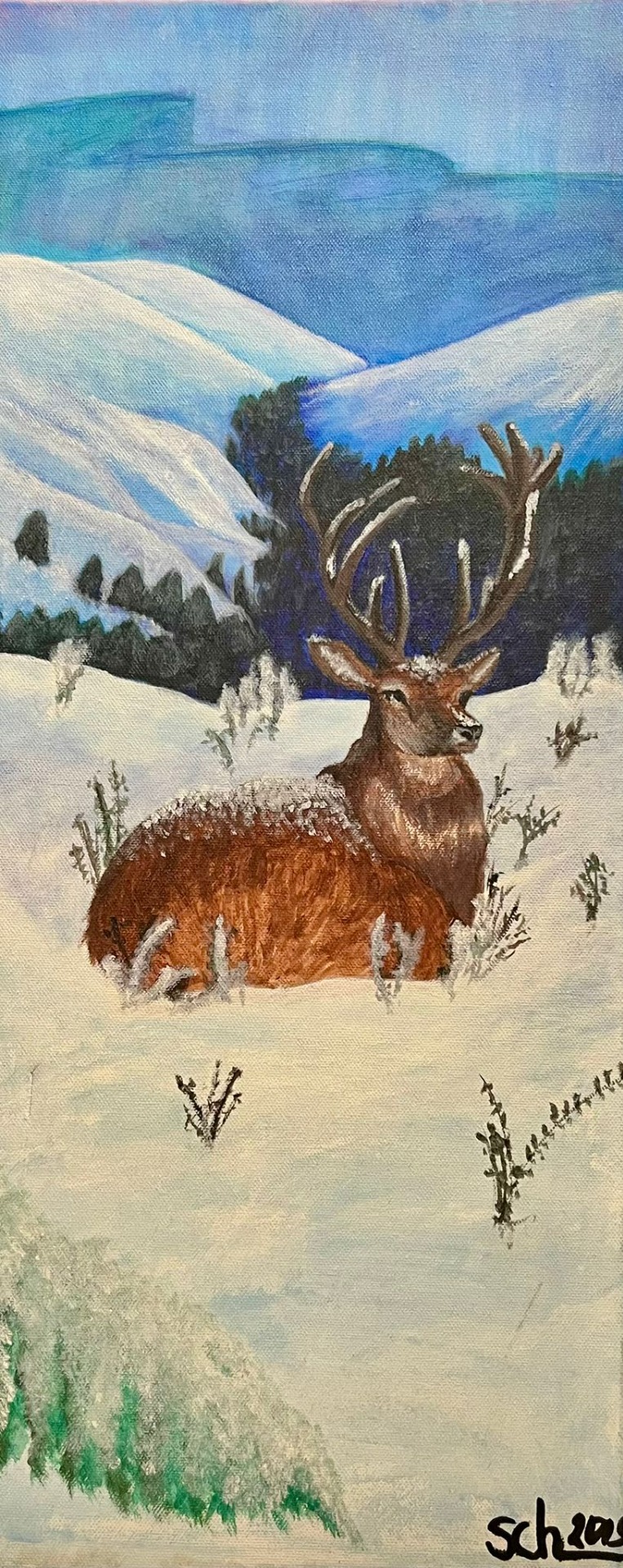 'Grace' depicts a powerful stag resting in the midst of a quiet, snow-covered winter landscape. At a time when I was feeling very low myself, this painting became a quiet expression of my inner world. The stag embodies both vulnerability and strength – it rests, even though it is surrounded by cold. The warm brown tones of its coat contrast with the icy blue layers of the mountains, reminding us that even in difficult times, a spark of inner dignity, hope and quiet strength remains.