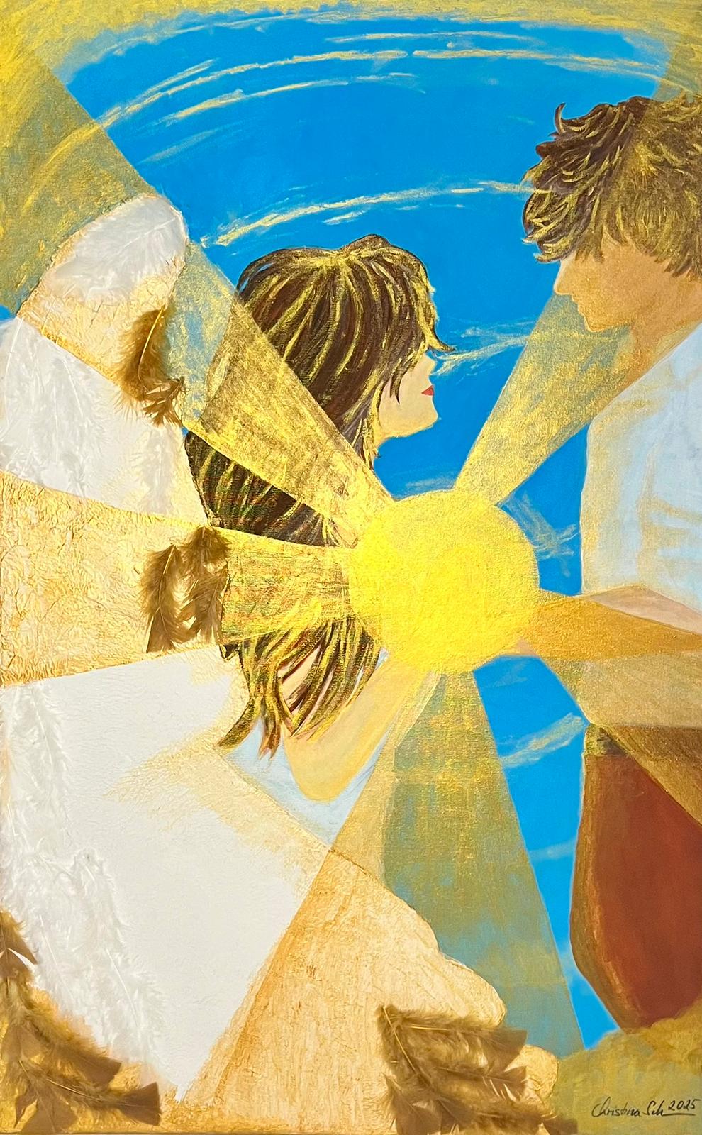 Dieses Werk zeigt die stille Begegnung des männlichen und weiblichen Selbst – nicht als Gegensätze, sondern als sich ergänzende Teile der Seele. Licht, Bewegung und goldene Oberflächen verbinden die Figuren und symbolisieren Mut und Hingabe, Klarheit und Intuition, Schutz und Sanftheit.